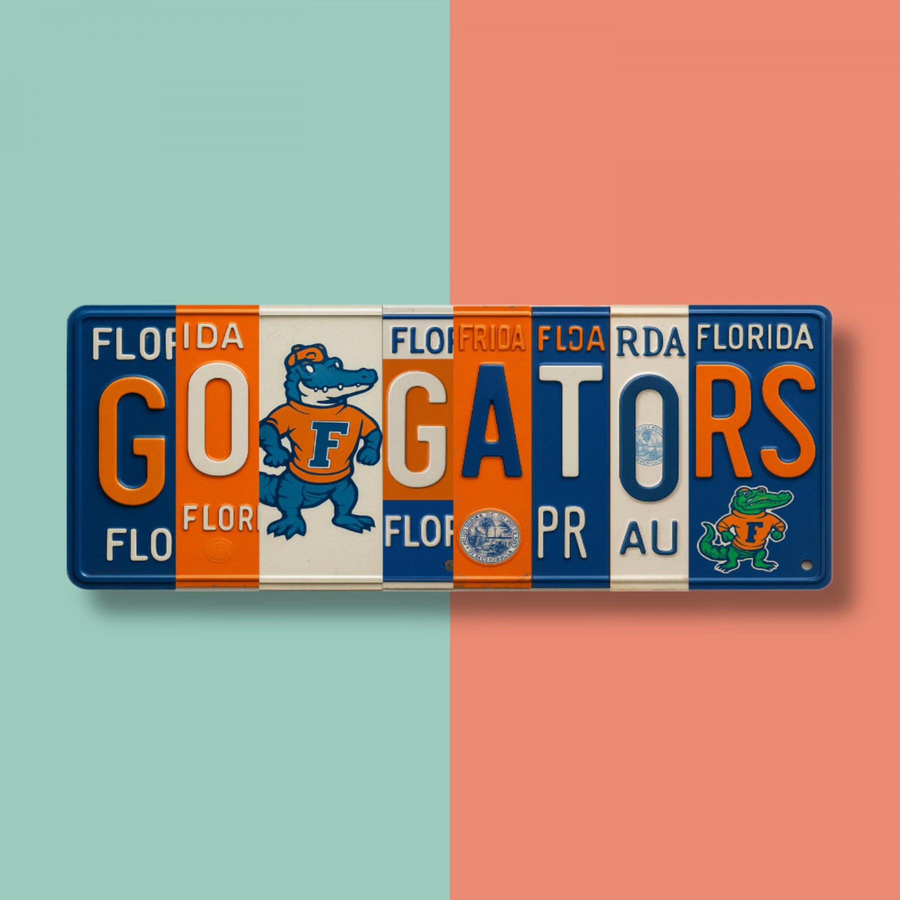 GO GATORS! Ignite your Florida Gators spirit with this “GO GATORS” license‑plate collage sign—an ultra‑clear, single‑print metal art piece that mimics authentic Sunshine State tags in vibrant orange & blue. University of Florida Ga.