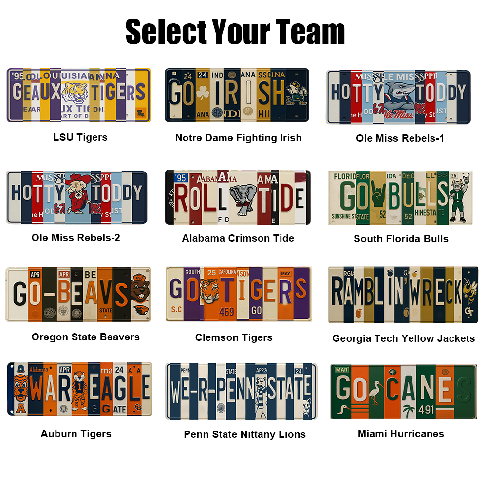 Show off your team pride with this license plate sign — a bold piece of metal wall art that captures the spirit of your favorite team through vintage-style state tags and signature colors.