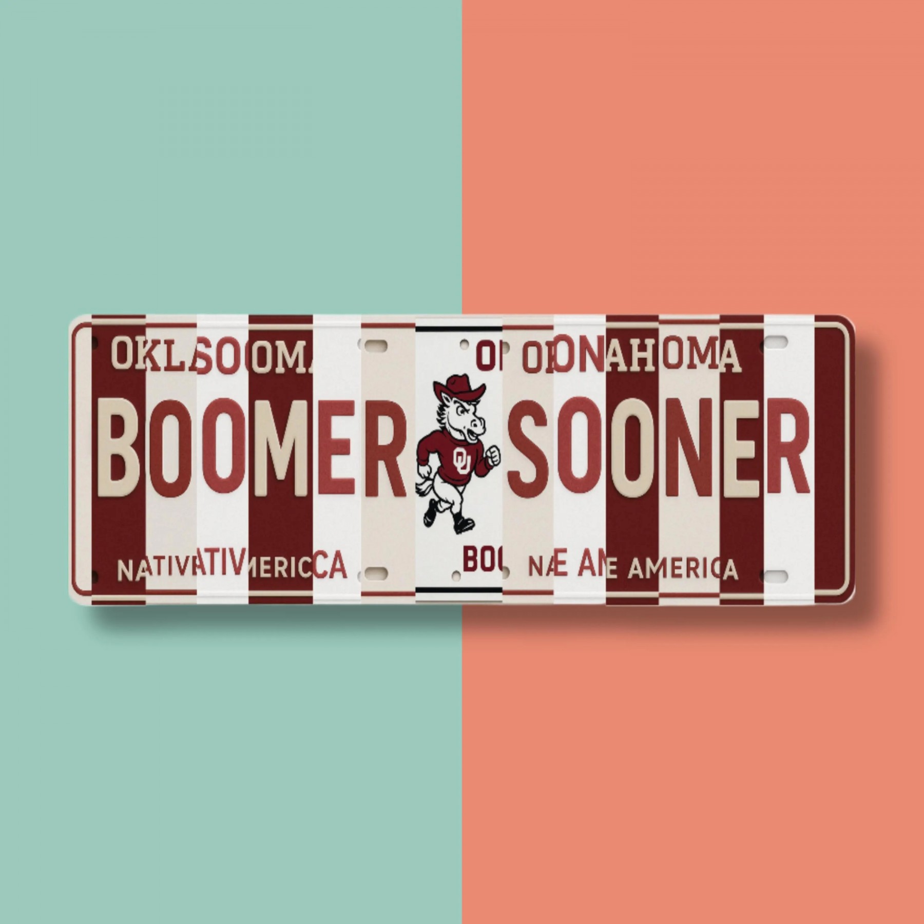 Boomer Sooner! Rally your Sooners spirit with our “Boomer Sooner” license‑plate collage sign—a single‑print metal wall art piece that looks like a patchwork of Crimson & Cream Oklahoma tags, without any heavy assembly.