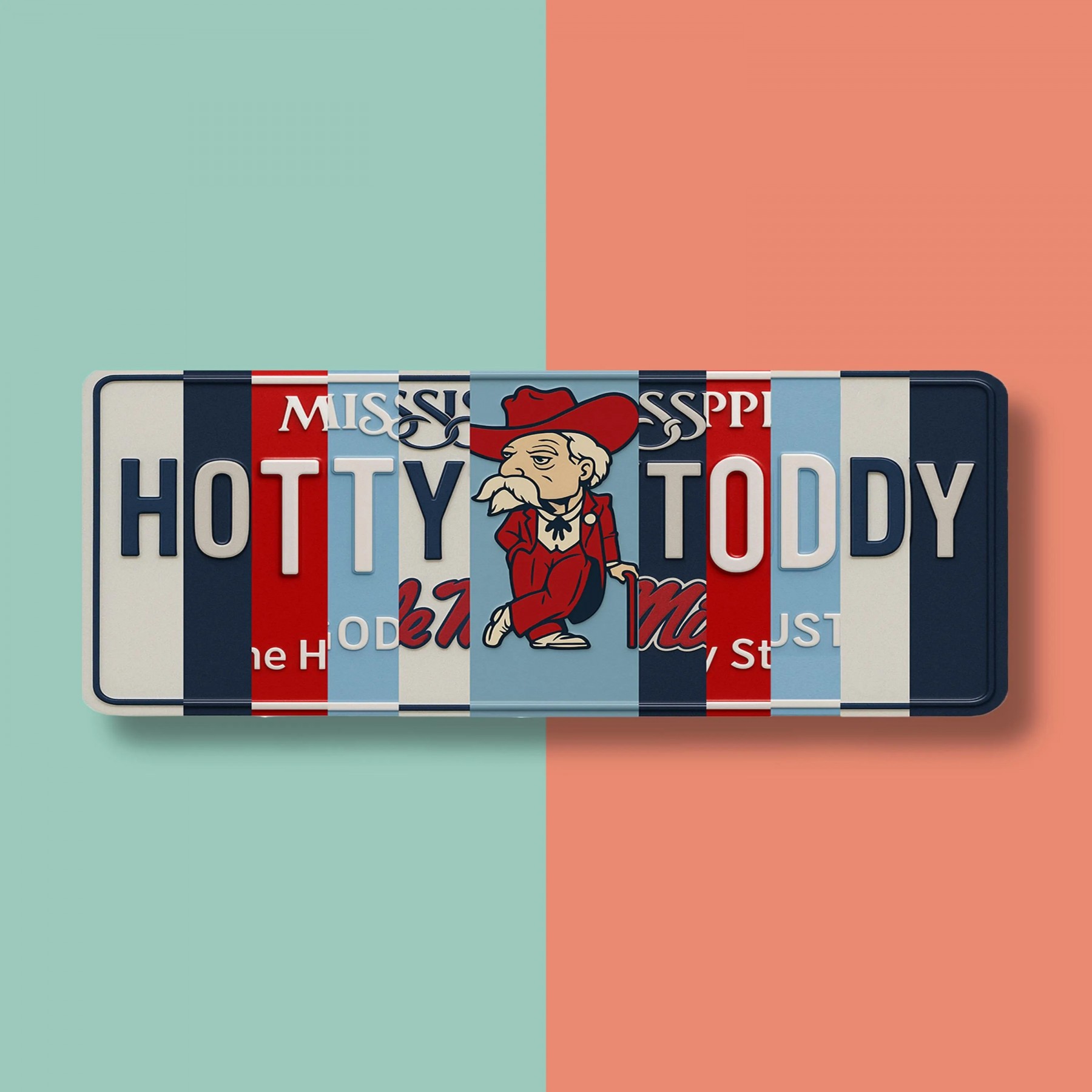 Show off your Ole Miss pride with this “Hotty Toddy” license‑plate collage sign—an eye‑catching, single‑print metal art piece that mimics vintage Mississippi tags in vibrant navy & cardinal.